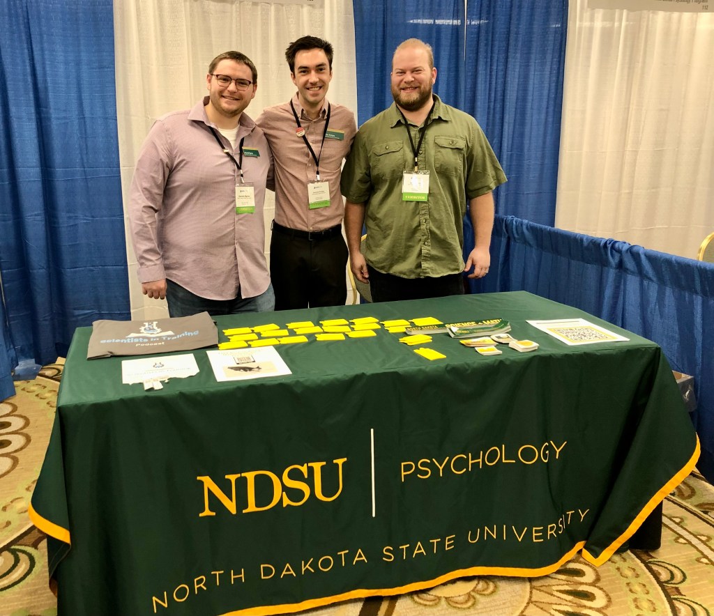 April 20-22, graduate students Sam Birkholz, Garrett Byron, and Alex Knopps, from the Johnson, Hilmert, and Wissman labs, respectively, hosted a NDSU Department of Psychology Graduate Program exhibitors table and the Ninety-Fifth Annual Meeting Midwestern Psychological Association in Chicago. This outreach received a lot of attention (they ran out of supplies!) and we hope makes more future graduate students aware of our graduate program here at NDSU.